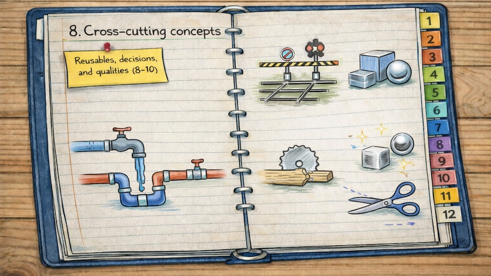 Chapter 8 is the patterns and practices chapter. It captures the reusable concepts that keep your domain code lean and your runtime scenarios readable: security, resilience, observability, integration rules, and other "plumbing" that should be consistent.