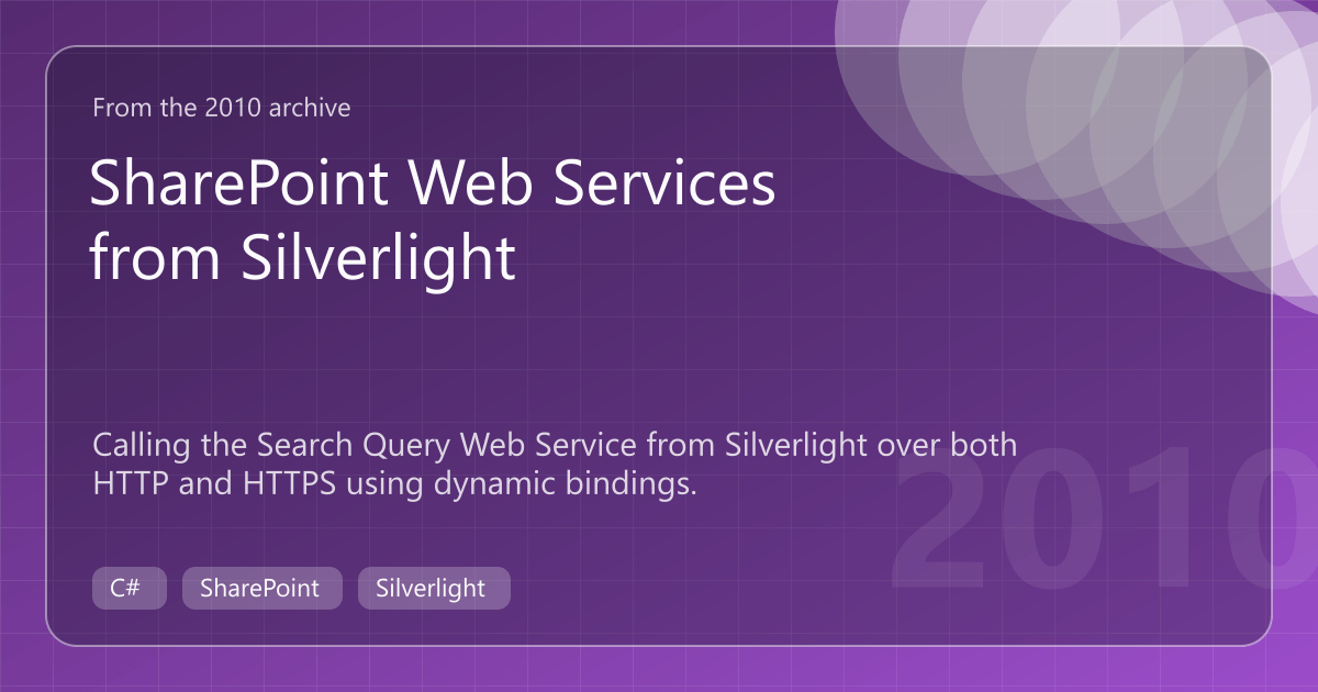 private void Page_Loaded(object sender, RoutedEventArgs e){ var endpoint = new EndpointAddress(GetParam("SharePointWeb") + "/_vti_bin/search.asmx"); var binding = new BasicHttpBinding(BasicHttpSecurityMode.None) { Name = "QueryServiceSoap", MaxReceivedMessageSize = 2147483647, MaxBufferSize = 2147483647 };