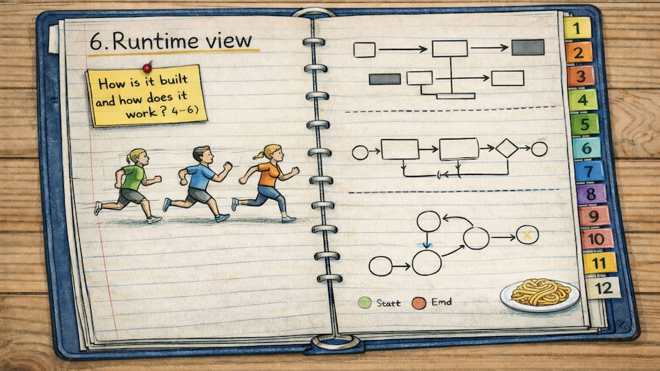 Chapter 6 describes runtime behavior: how building blocks collaborate in the scenarios that matter, including alternatives, exceptions, and the bits that tend to hurt in production. It is also the last chapter in the "How is it built and how does it work" group.