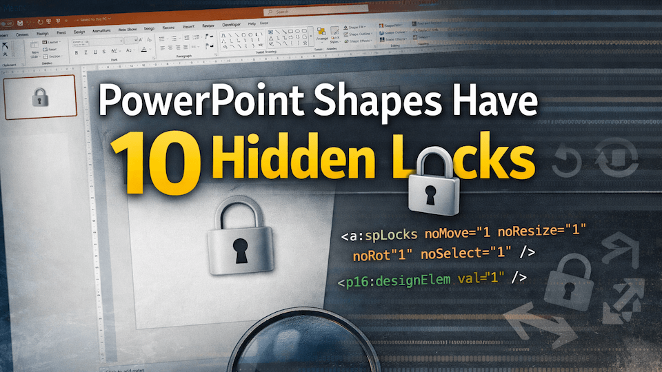 Every shape in PowerPoint can be locked in ten different ways: movement, resizing, rotation, selection, text editing, and more. Each lock has its own flag. But the PowerPoint UI barely exposes any of this, so most people never realize that this level of control is possible.