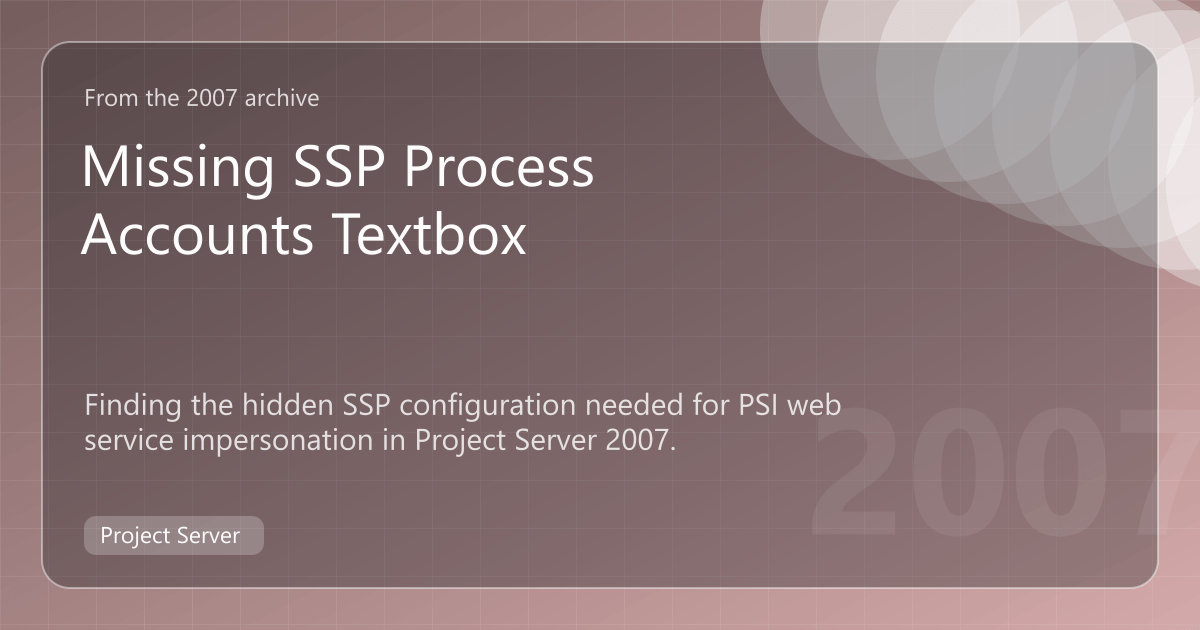 I had a lot of trouble using impersonation with the PSI web services in Project Server 2007. I found some posts on the web suggesting that you need to add the account to the “Process Accounts with Access to the SSP” textbox, but guess what? That box was nowhere to find!